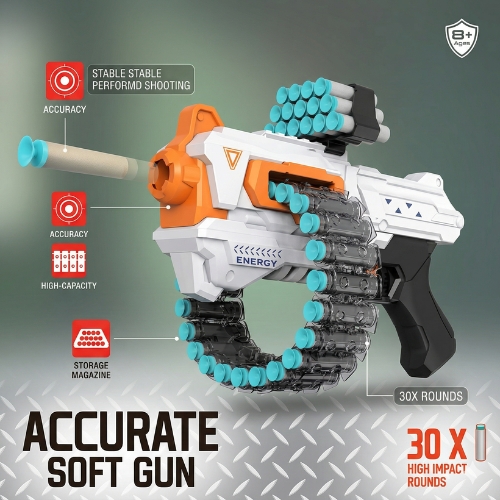 A high-performance accurate soft dart gun designed for fun and safe shooting play. It features a high-capacity rotating magazine, stable shooting mechanism, and comes with 30 high-impact foam rounds for extended gameplay.